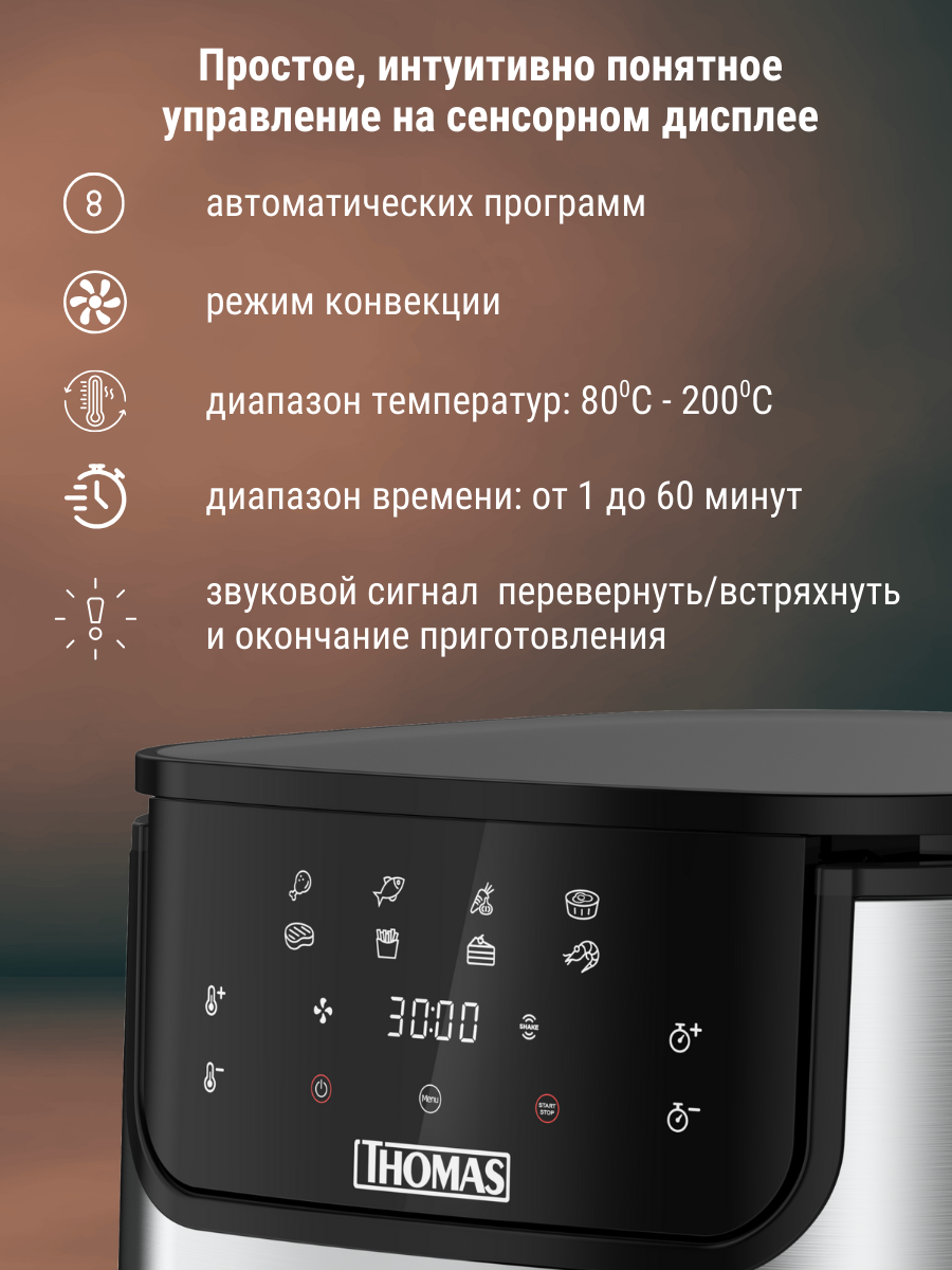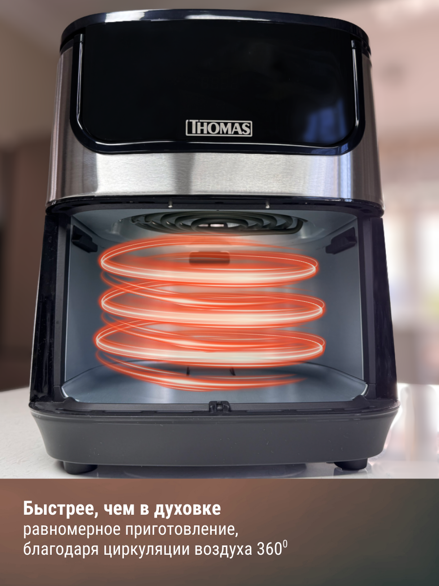 Настоящий помощник на кухне аэрогриль Thomas GUSTO приготовит великолепные завтраки, обеды и ужины за 15-20 минут. Вместительная чаша 7,5 литров это идеальный объем для приготовления 3-6 порций.
