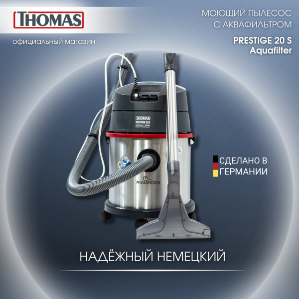 Thomas Prestige 20S Aquafilter Надёжный моющий пылесос с корпусом из высококачественной нержавеющей стали. Сухая уборка без мешков. Аквафильтр циклонного типа обеспечивает постоянно высокую мощность всасывания. Большой резервуар для чистой воды - 4.7 л.