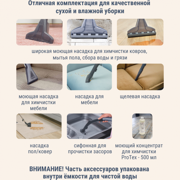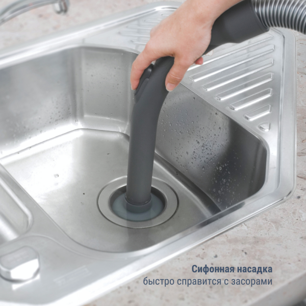 Prestige 20S укомплектован всеми аксессуарами, которые необходимы для эффективной сухой и влажной уборки, а также дополнительной сифонной насадкой для прочистки стоков.