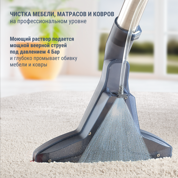 Объем резервуара для моющего раствора составляет 4,7 л, что позволяет сделать влажную уборку большой площади без дозаправки.